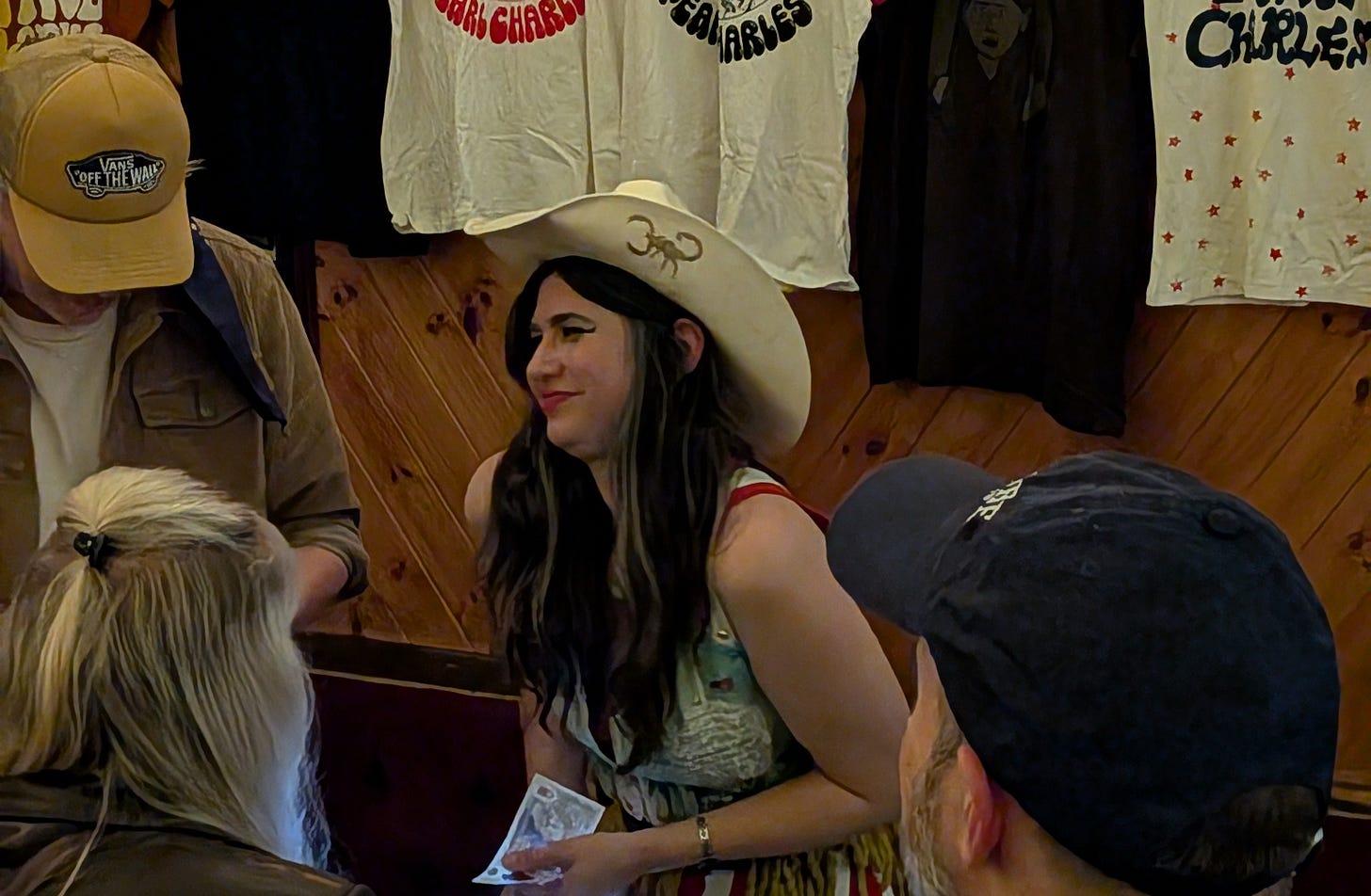 Pearl and band walked on at 9pm. I knew more or less what to expect from her reels on Instagram: that was why I came along. But I learned something that night, and it is something I re-learn every time I see a live band. There is something unique and special about live music. It is a secular religious shared experience. No matter how good your headphones or speakers, your pre-amp or your gold-plated phono leads, nothing beats having an artist's twangs reach your ear unaccompanied by any electrical interference. They're using microphones of course, but apart from that. And speakers too. But apart from that.