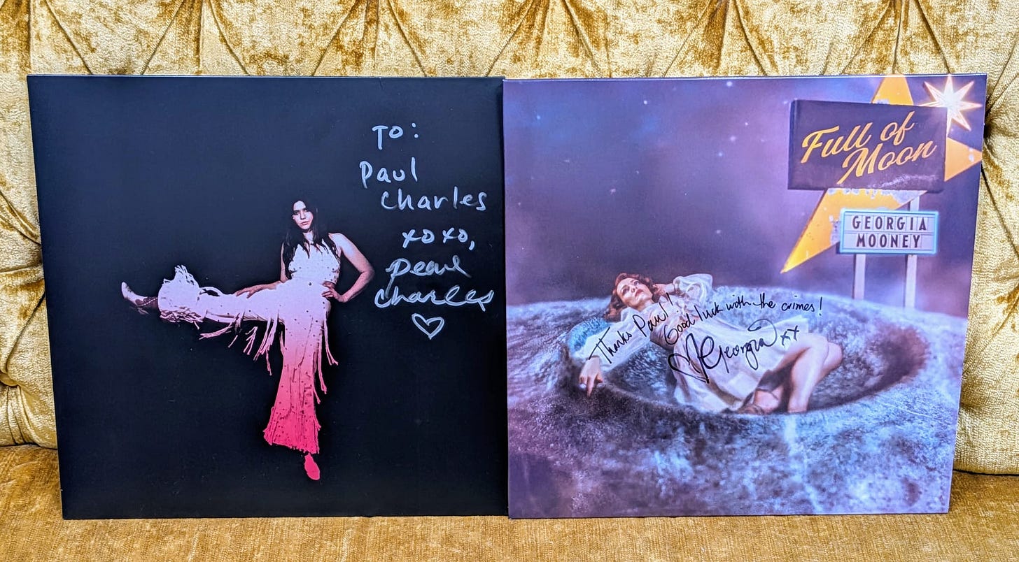 Pearl is even nicer and more talented than you might realise. She is the only artist I have ever seen who manned her own card-reader on the merch stall. After the final encore, she leapt off the stage and went straight over to talk to her fans at the merch stand. This is the photo at the top. She talked to everyone, took selfies, signed stuff, and made everyone in the busy queue feel special. The mirth above is for the person who used cash [Cash? Never heard of it. You mean Johnny? Ed.] and even that little challenge was neatly sorted out. She even has a tip for pro musicians: keep one of your thumbnails a little longer than the rest. It won't interfere with your guitar playing and can be used like a knife to slit the cellophane on a record faster than anything else. Nobody wants signed cellophane.